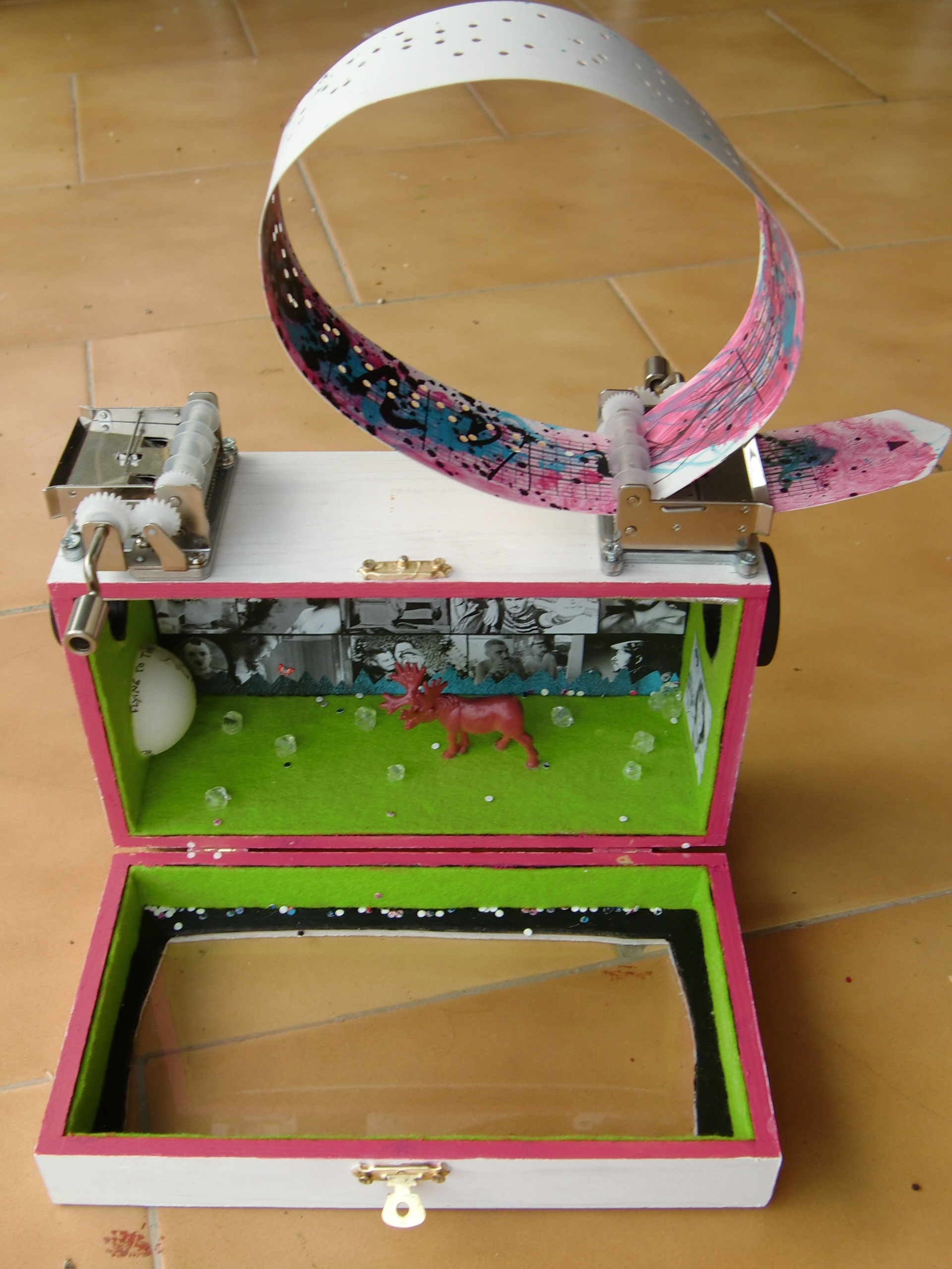 Caja de madera pintada a mano que sirve de resonador y de recipiente para guardar la partitura.